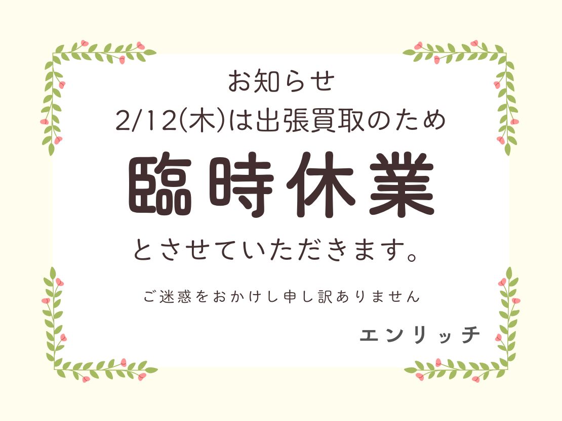 本日、2/12(木)は、出張買取のため臨時休業とさせていただきます。